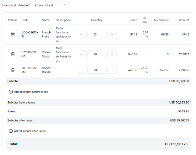 Indicate taxes to be calculated after the subtotal. That is, the tax is calculated after calculating Quantity x Price.
