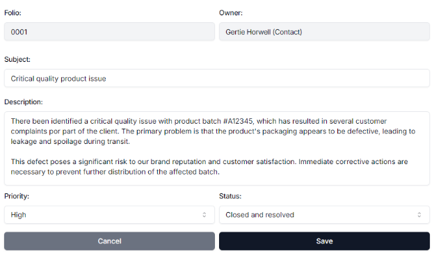 Once the case is created, you can edit the fields as many times as necessary. To edit it, open the form options menu by clicking on the button at the top right and click on the Edit option.