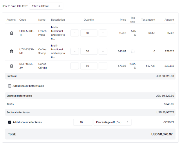 Look at the image below that applies a discount of a percentage of the subtotal after considering taxes.