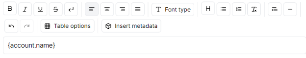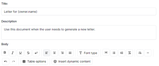 - Body. Write the draft of the document. Use the editor buttons to format text as any other text editor, insert tables, add lists among other functions. You can add up to 500k characters per template.