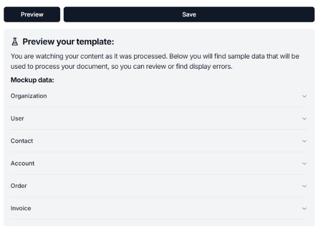 Click on the button Preview which is located next to the Save button.** This will make the content of your template be processed with a set of testing information and get displayed at the bottom of the page.