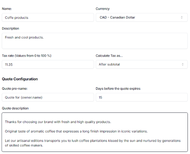 - Description. Enter a description to display about your brand, products or services. This will be shown in the quote print view.