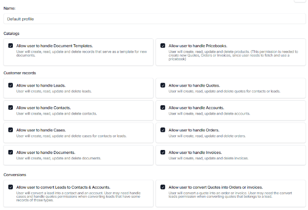 A profile helps to assign special permissions to users that do not have the role of Admin or Root. Permissions allow these users to make specific actions across your organization, while placing constraints on others. Actions tells what an user can do over catalogs, customer records and conversions.