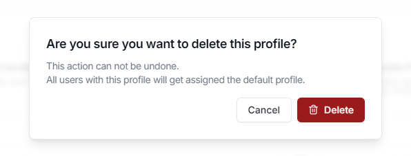 Go to the profile page, by clicking the user menu in the upper right corner and then click the Profiles item. Search and select the profile you want to delete.
