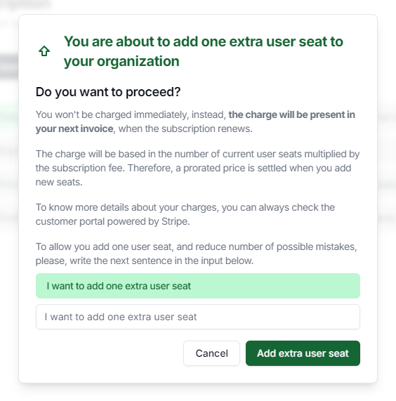 Increase the number of seats for users by clicking the Add one user seat button. A dialog will be presented to mention the changes on your subscription. Read the changes carefully. Type in the text box “I want to add one extra user seat” and click Add extra user button to confirm.