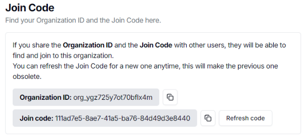 Copy and share the Organization ID and Join Code only with users you want to join your organization.