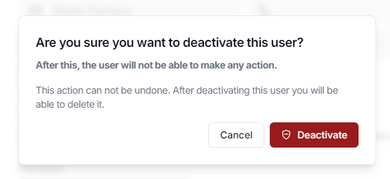 Then click on the form options menu and click on the option Deactivate. A dialog will ask if you want to deactivate that user. Click the button Deactivate to deactivate the user.